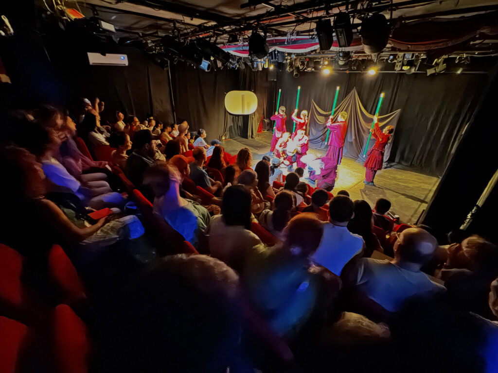 Despite their annual presence in Avignon, the Santuoqi team’s path is never without challenges. Learning from last year’s prop delays, the crew carried over 100 props and puppets onboard themselves this time. To protect the gear from other travelers’ luggage, they lined up an hour early at the gate to ensure proper placement.